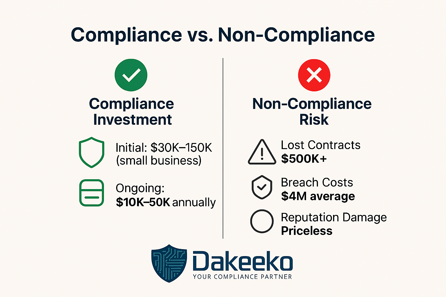 Failing to meet CMMC requirements can be far more expensive than achieving compliance. Risks include:
